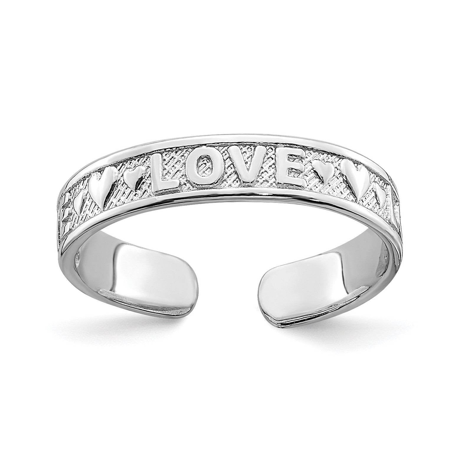 Elevate your style with this exquisite 14K real solid white gold polished love and hearts toe ring. Crafted from the finest materials, this delicate piece of jewelry adds a touch of elegance and sophistication to any outfit. The polished finish catches the light beautifully, while the intricate heart and love designs symbolize affection and romance. Designed to fit comfortably on your toe, this ring is perfect for everyday wear or special occasions. Whether you're dressing up for a night out or simply want to add a touch of glamour to your casual look, this 14K white gold toe ring is a timeless accessory that will never go out of style. Treat yourself or someone special to this beautiful piece of fine jewelry.