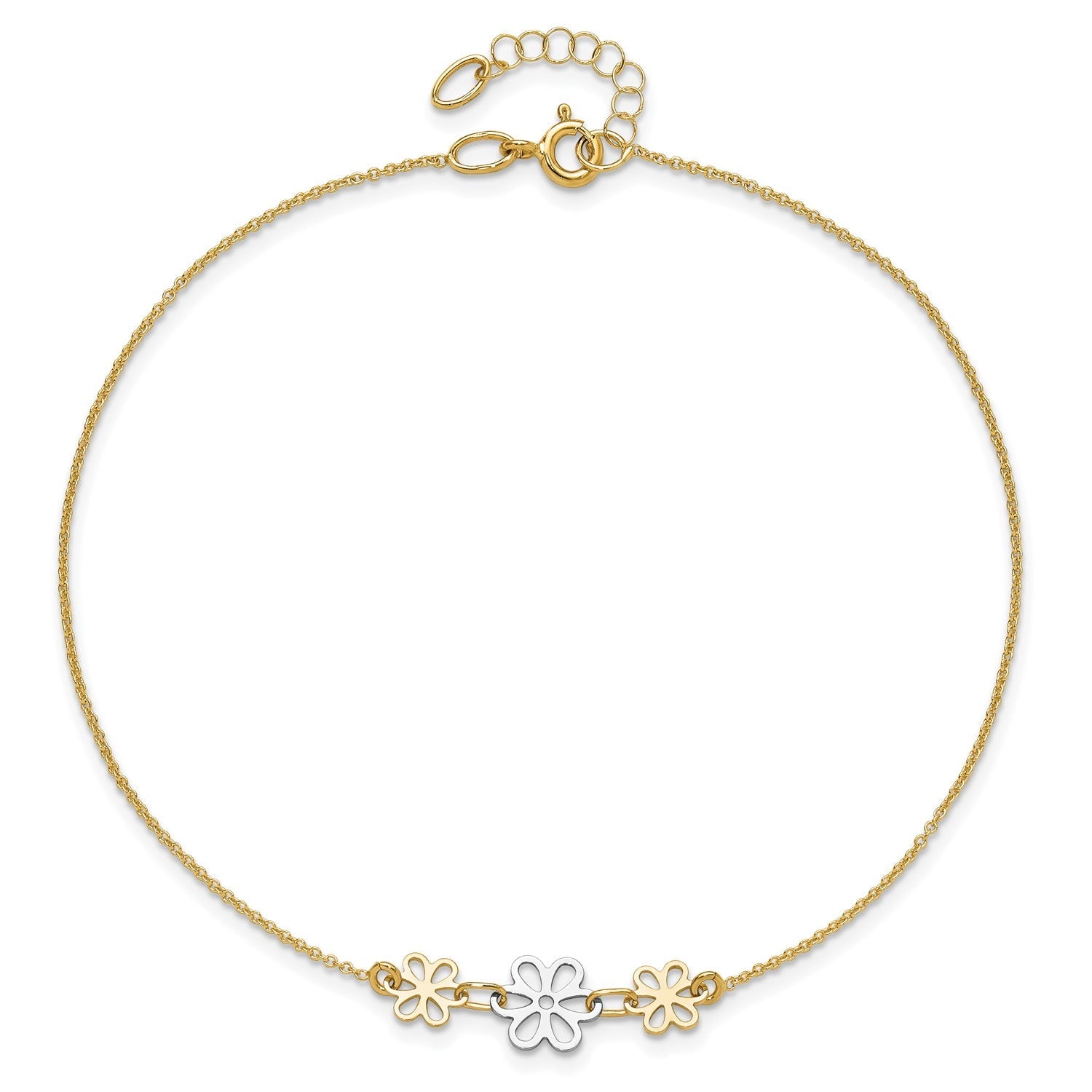 Elevate your style with this exquisite 14k real two-tone yellow gold three flower charm adjustable anklet. Crafted with precision, this delicate piece features a sleek gold chain adorned with three charming flower charms in contrasting yellow and white gold hues. Adjustable from 9 to 10 inches, it offers a comfortable and secure fit. This anklet effortlessly adds a touch of elegance to any ensemble, making it a versatile accessory for casual or formal occasions. Indulge in the timeless beauty of this finely crafted anklet and embrace a touch of luxury.