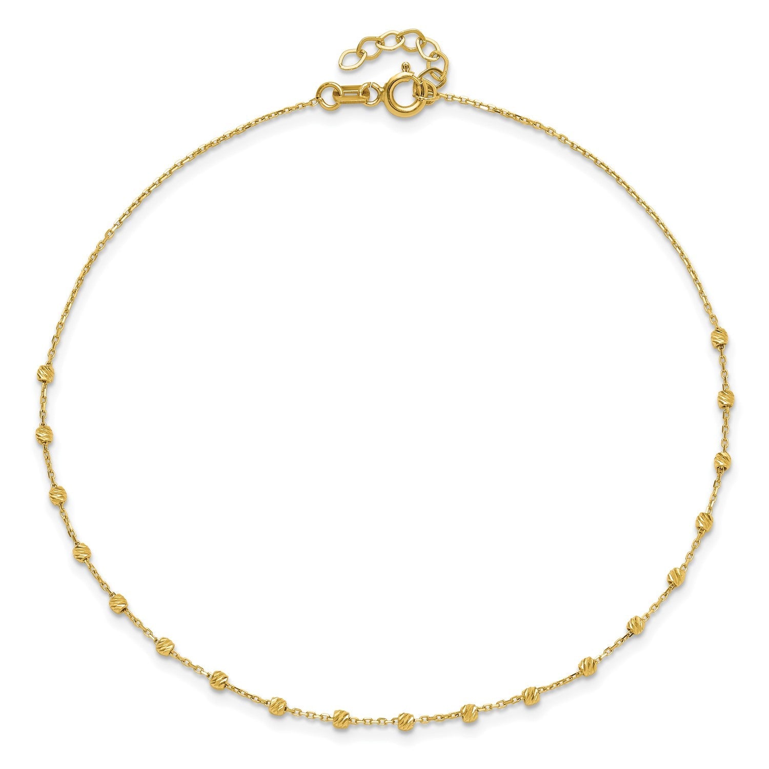 Elevate your style with this exquisite 14k real yellow gold anklet. Crafted with meticulous attention to detail, this delicate piece features a high-polished diamond-cut beaded design that adds a touch of elegance to any outfit. Adjustable from 9 to 9.75 inches, it offers a comfortable and secure fit. Whether you're dressing up or keeping it casual, this anklet is a versatile accessory that will complement your look effortlessly. Treat yourself or someone special to this timeless piece of jewelry that will be cherished for years to come.