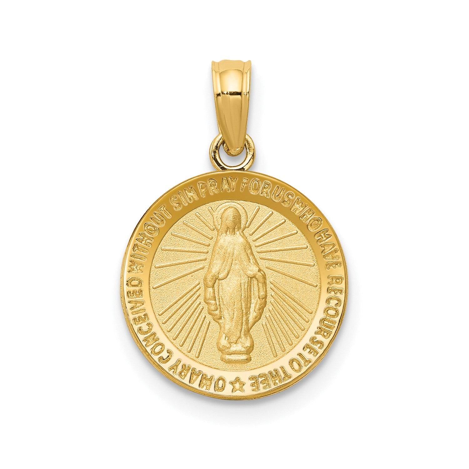 This exquisite 10k solid yellow gold pendant is a stunning representation of the Miraculous Mary, a beloved Catholic symbol. Measuring 13mm (approximately 0.51 inches) in size, this charm is a beautiful expression of faith and devotion. Crafted from genuine 10k yellow gold, it showcases exceptional craftsmanship and attention to detail. The intricate design captures the serene and graceful image of the Virgin Mary, making it a cherished piece for those seeking spiritual guidance and protection. Whether worn as a pendant or carried as a charm, this Miraculous Mary charm is a timeless treasure that will be treasured for years to come. Its rich golden hue and enduring quality ensure it will remain a treasured keepsake, serving as a constant reminder of faith and divine blessings.