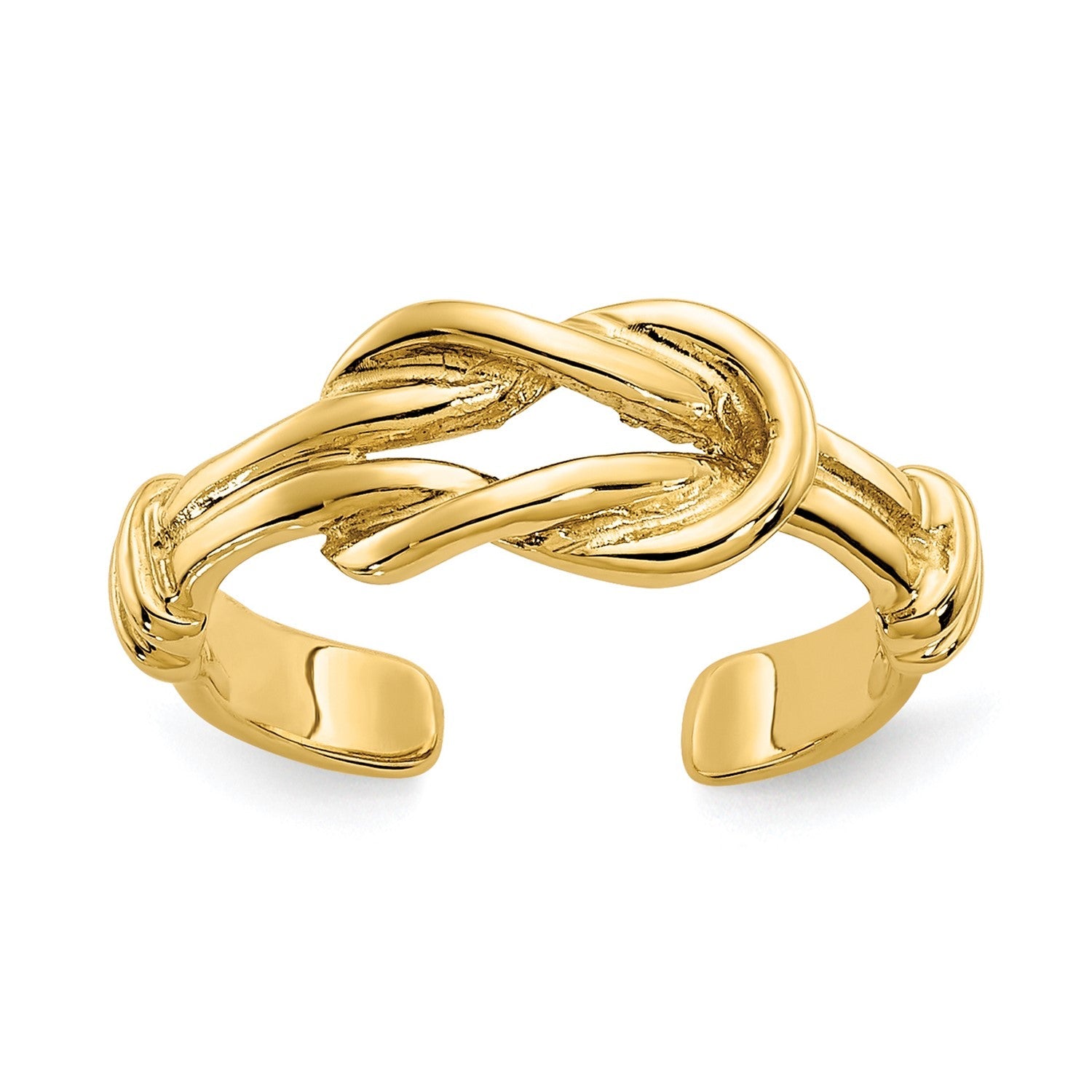 Timeless Design: This elegant 10K yellow gold toe ring features a classic double knot pattern, adding a touch of sophistication to any outfit. The width of the ring is at 2mm