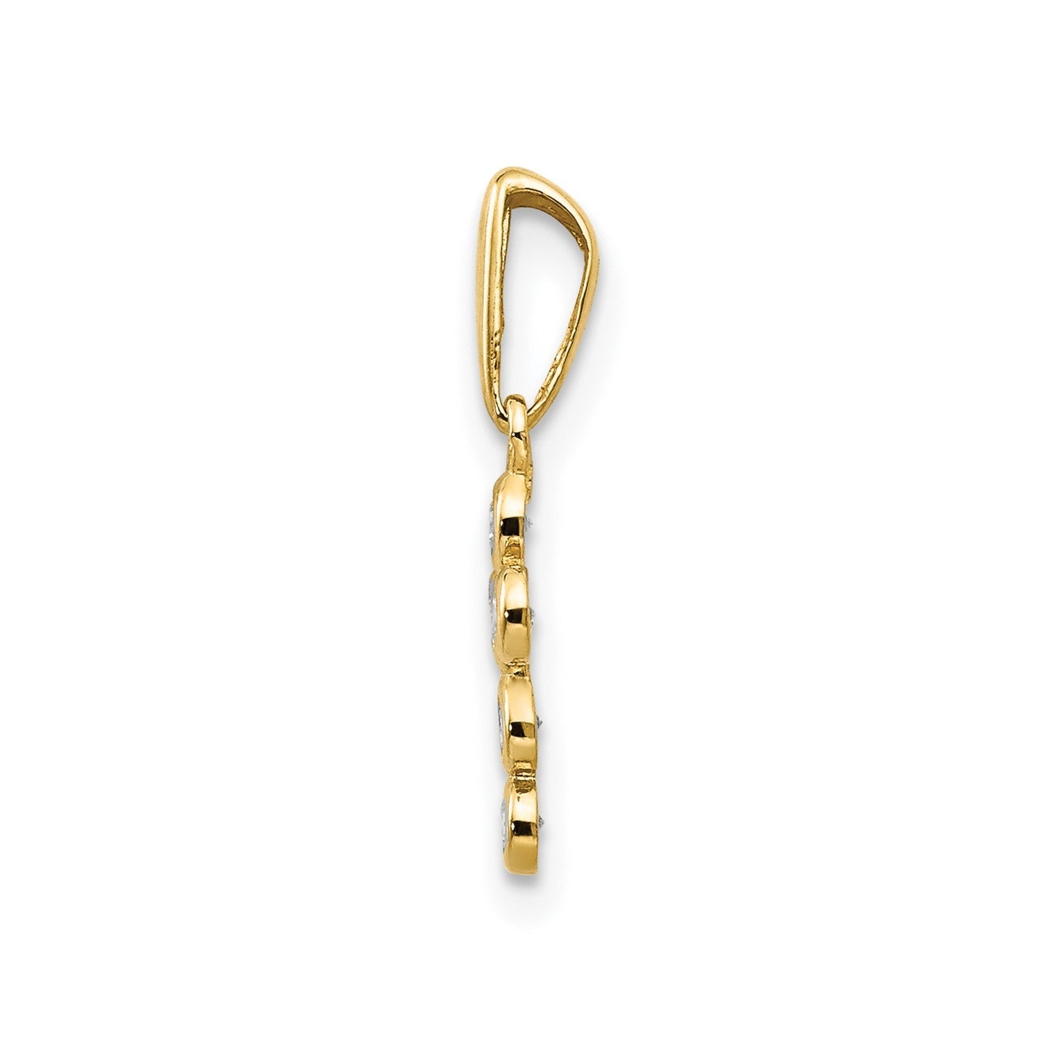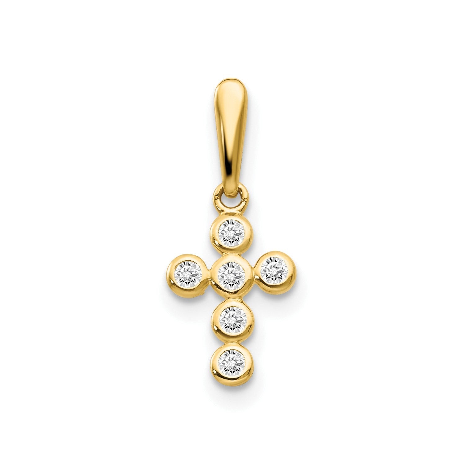 Elevate your faith and style with this exquisite 14k real solid gold CZ small cross pendant charm. Measuring 10x7mm (0.39x0.28 inches), this dainty yet striking piece features a classic cross design adorned with brilliant cubic zirconia stones that catch the light beautifully. Crafted from genuine 14k yellow gold, this pendant is a symbol of unwavering devotion and timeless elegance. Whether worn as a standalone necklace or layered with other pieces, this cross pendant charm adds a touch of radiance and spiritual significance to any outfit. Celebrate your beliefs and elevate your jewelry collection with this precious and meaningful accessory. Perfect for children and baptism