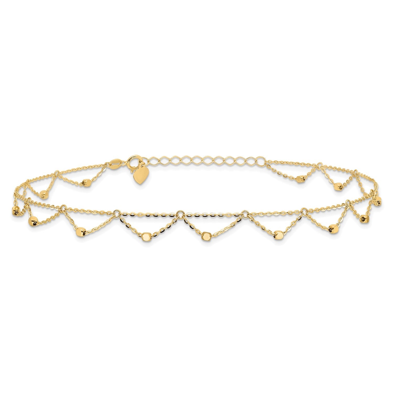 Elevate your style with this exquisite 14k real yellow gold high polished and diamond-cut fancy anklet. Crafted with meticulous attention to detail, this dainty ankle bracelet is the epitome of elegance and sophistication. Measuring 10 inches (25.4 cm) in length and adjustable up to 11.5 inches (29.2 cm), it ensures a perfect fit for a variety of ankle sizes. The high polish finish and diamond-cut detailing catch the light beautifully, adding a touch of glamour to any outfit. Whether you're dressing up for a special occasion or simply want to add a touch of sparkle to your everyday look, this anklet is a timeless accessory that will elevate your style. Lightweight and comfortable, it's the perfect piece to wear all day and night. Indulge in the luxury of real 14k yellow gold and make a statement with this stunning anklet.