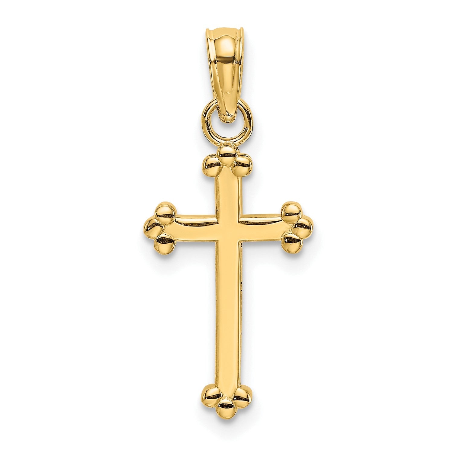 Elevate your faith and style with this exquisite 14k real yellow gold high polished beaded cross pendant. Measuring 15x8mm (approximately 0.59x0.31 inches), this timeless piece is a testament to exceptional craftsmanship and attention to detail. The high polish finish accentuates the intricate beaded design, creating a captivating play of light that draws the eye. Whether worn as a symbol of devotion or a stylish accessory, this pendant is a versatile addition to any jewelry collection. Crafted from genuine 14k yellow gold, it promises lasting beauty and durability. Embrace the elegance of this 14k real yellow gold high polished beaded cross pendant and let it become a cherished keepsake for years to come.
