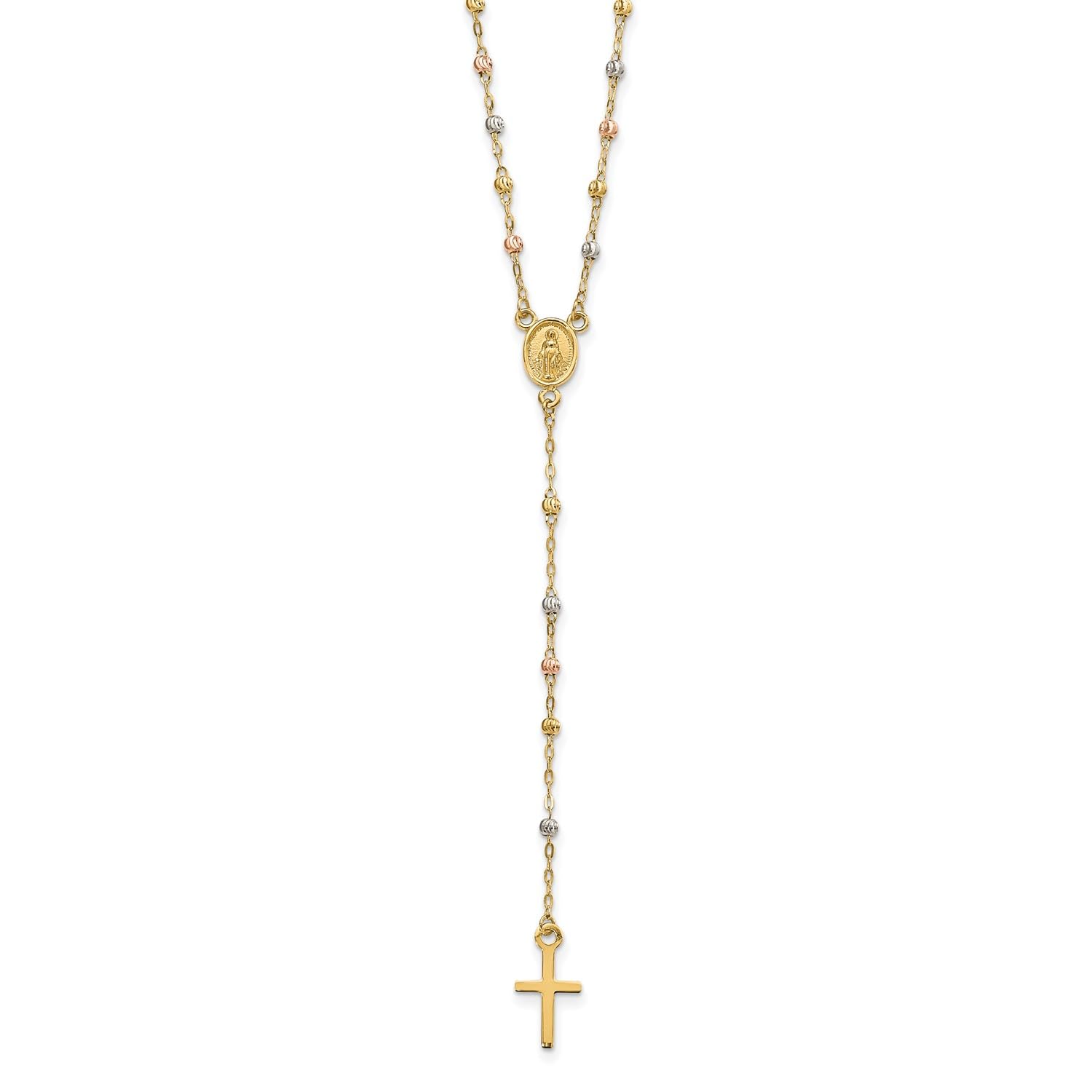 14k Tri-color Gold Beaded Rosary Cross Necklace, 17 to 20 Adjustable