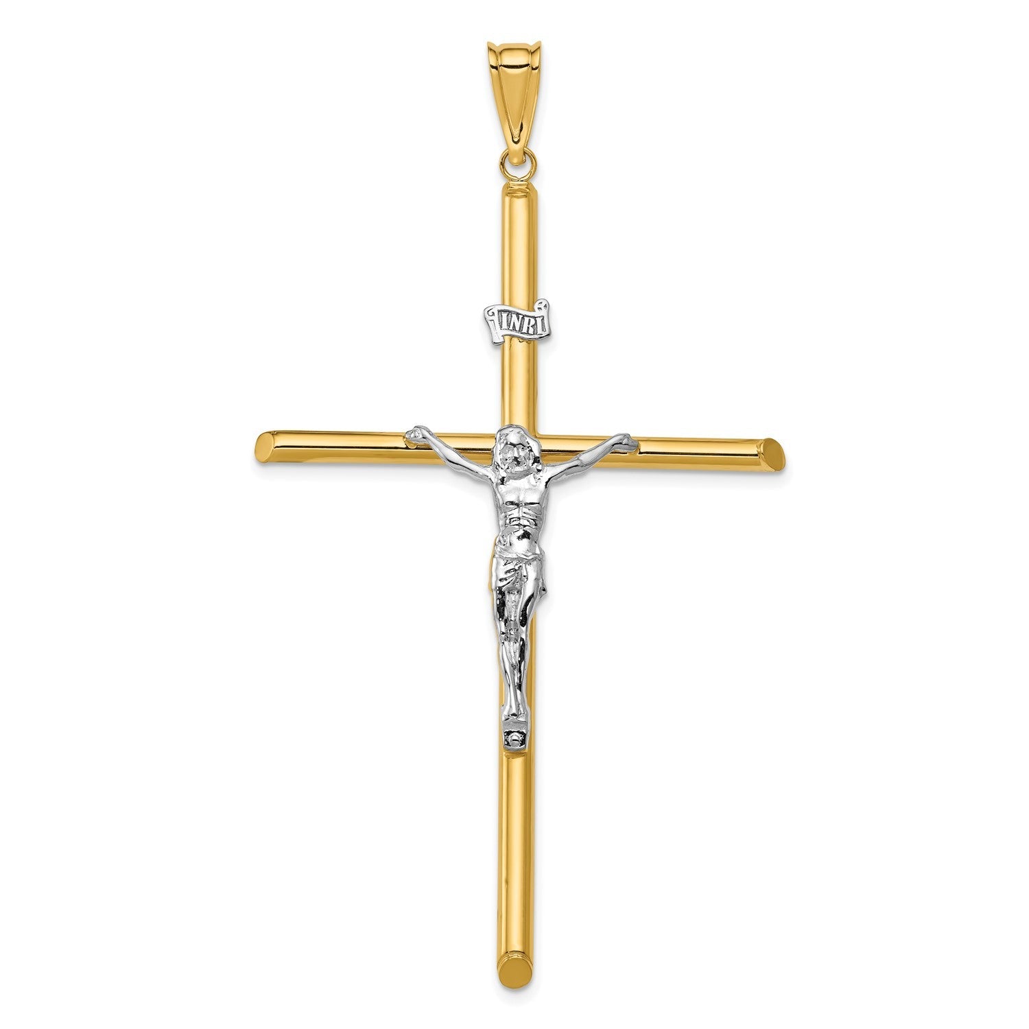 Elevate your faith with this exquisite 14k two-tone gold crucifix pendant. Crafted with meticulous attention to detail, this pendant features a polished gold cross adorned with a finely sculpted silver-tone figure of Jesus Christ. The high-polish finish lends an elegant shine, making it a striking accessory for any occasion. Measuring 76x42mm, this pendant is a timeless symbol of devotion and spirituality. Its versatile design allows it to be worn with various necklace chains or as a standalone piece. Whether you're looking to express your religious beliefs or simply appreciate the intricate artistry, this crucifix pendant is a beautiful addition to any jewelry collection.