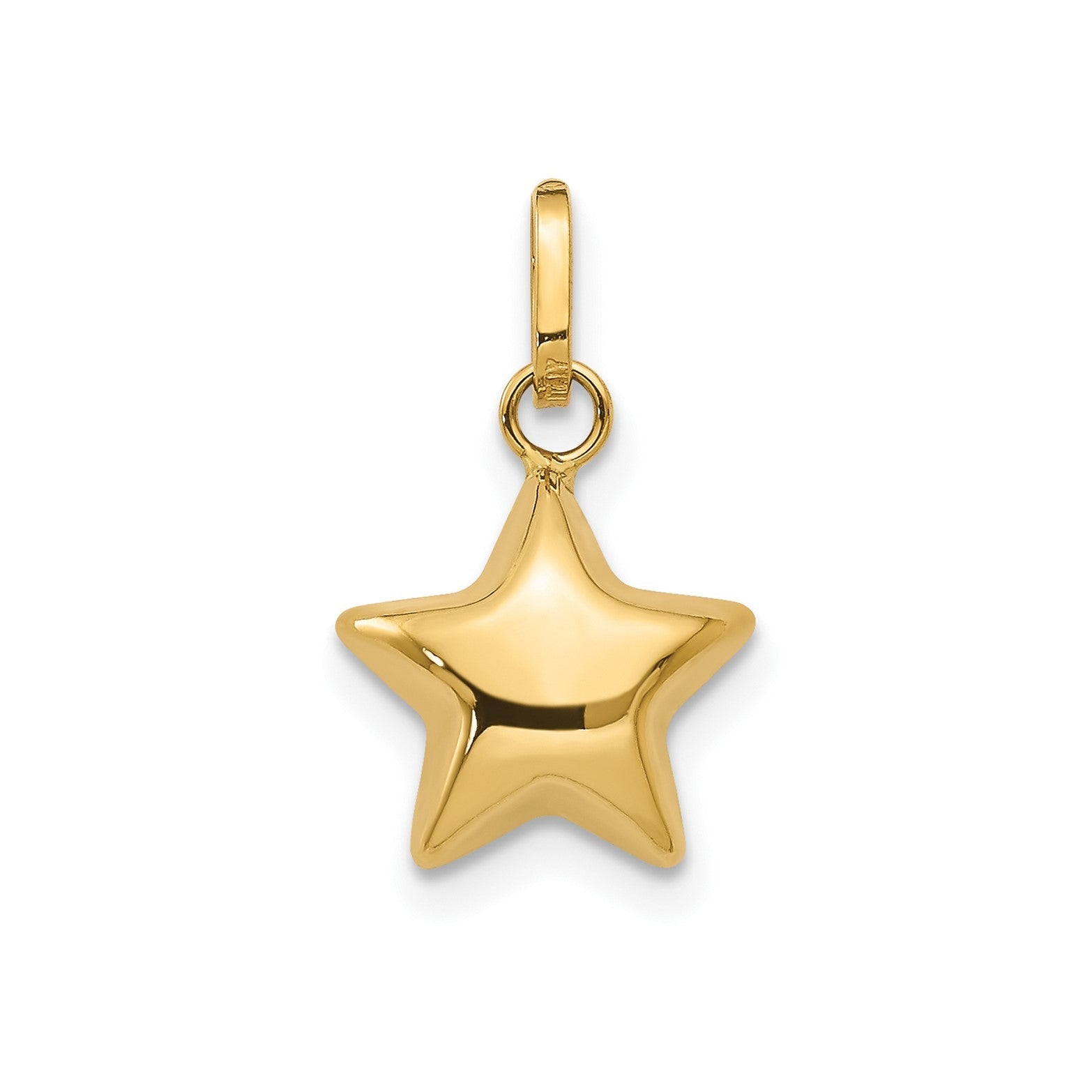 Elegant Design: 14k yellow gold puffed star charm pendant with a 3D design, measuring 14x10mm (0.55x0.39 inches). The weight of the charm is 0.4 grams