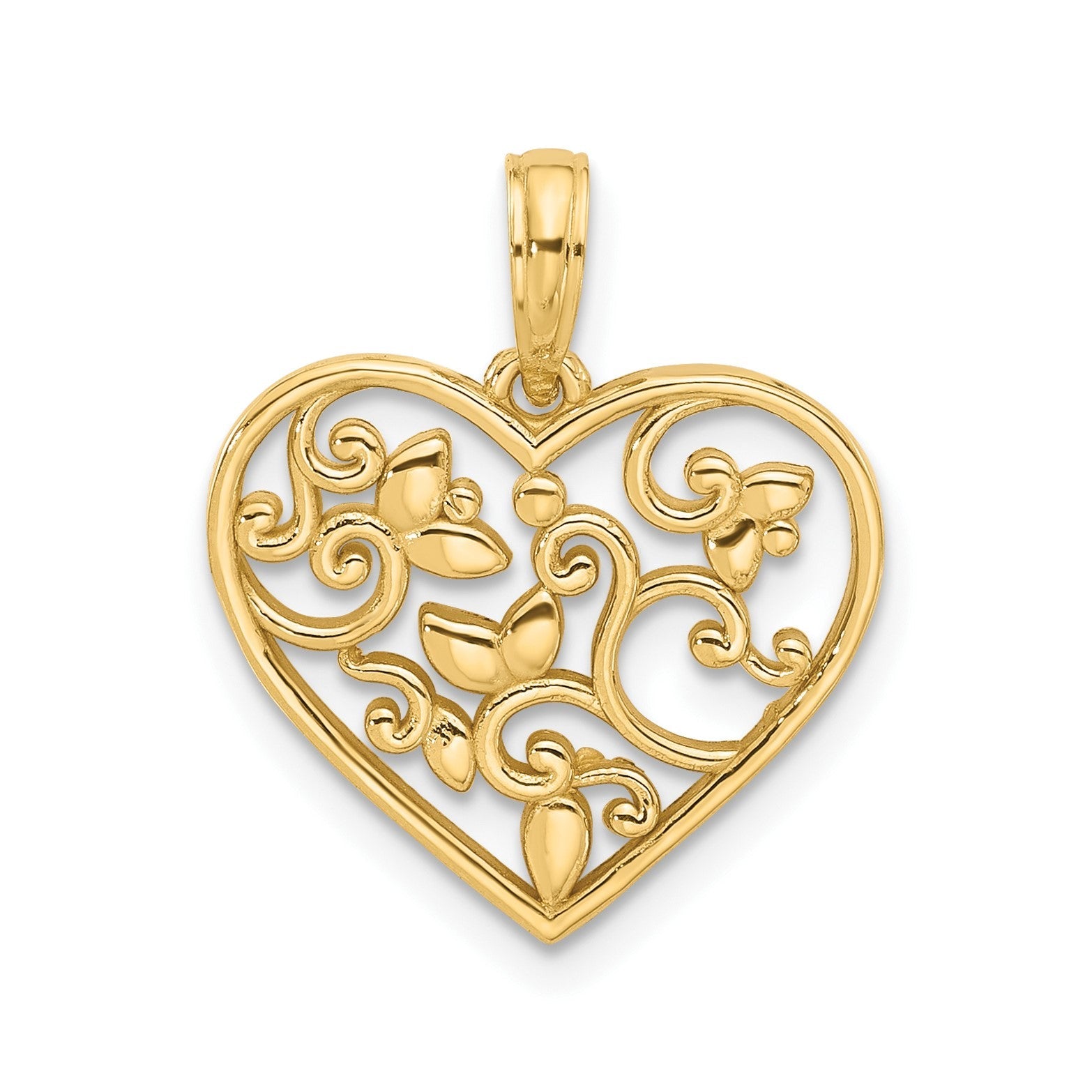 Elevate your style with this exquisite 14K yellow gold heart pendant. Crafted with meticulous attention to detail, this pendant showcases an intricate floral design that adds a touch of elegance to any outfit. The delicate swirls and intricate patterns create a captivating visual appeal, making it a standout accessory. Measuring 20x18mm, this pendant is the perfect size to make a statement without being overwhelming. Whether you're dressing up for a special occasion or adding a touch of sophistication to your everyday look, this heart pendant is a timeless choice that will leave a lasting impression. Treat yourself or surprise a loved one with this stunning piece of jewelry.