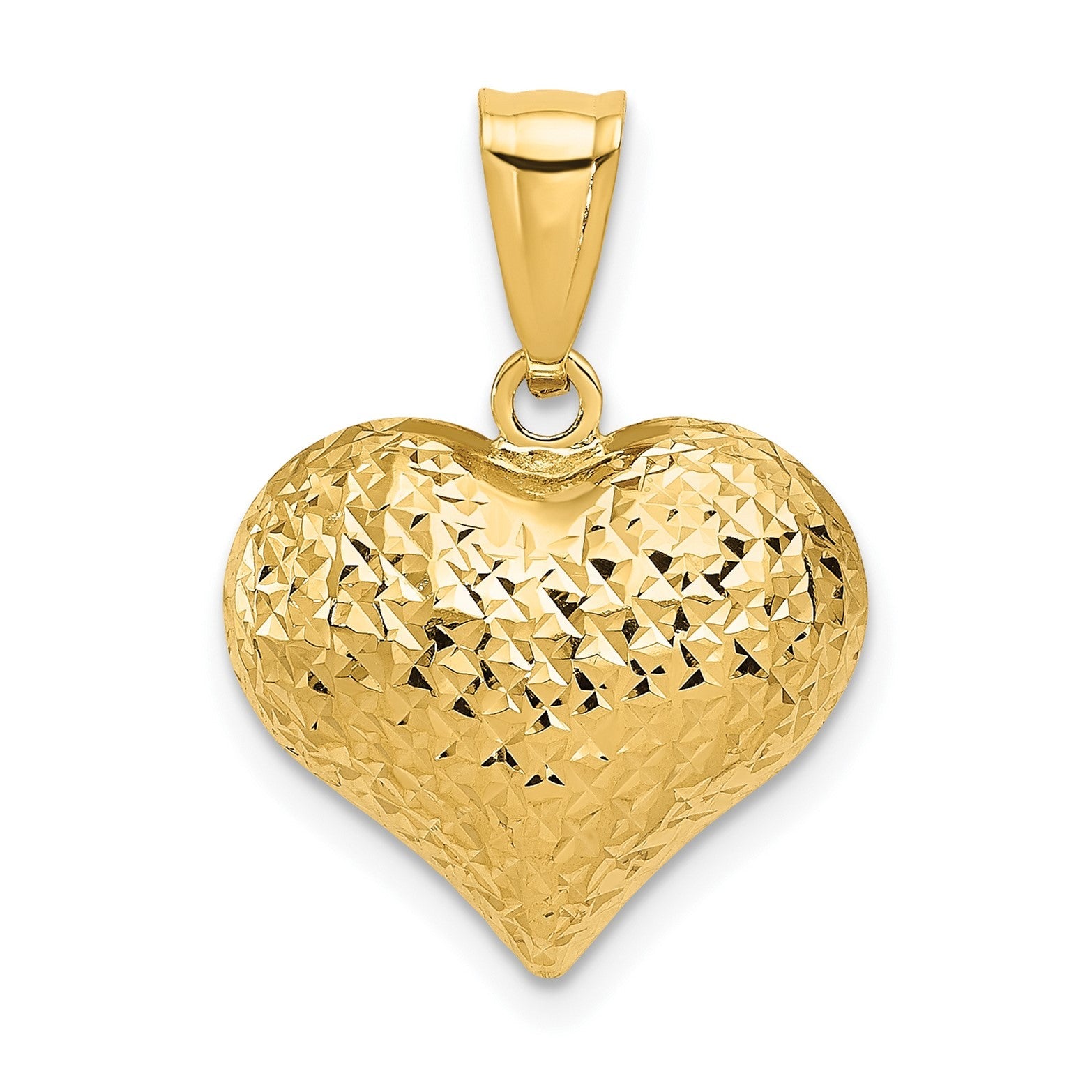 Elegant Design: This 14K yellow gold pendant features an exquisite textured heart shape with a high polish finish, adding a touch of sophistication to any outfit. The weight of this pendant is at 0.87 grams
