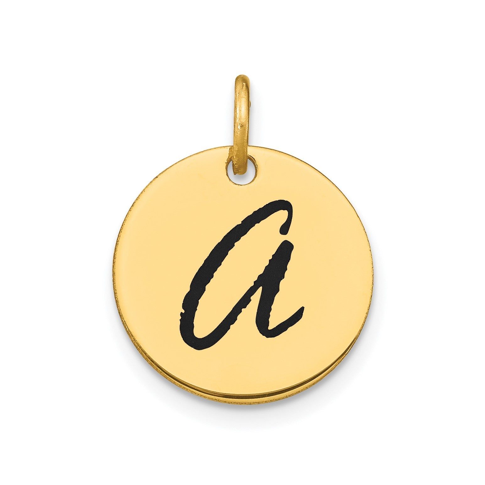 Elevate your personal style with this exquisite 14k yellow gold initial disk pendant. Crafted with meticulous attention to detail, this elegant piece features a sleek circular design with a beautifully engraved initial in striking black enamel. The high-polish finish adds a touch of sophistication, making it a versatile accessory that can be dressed up or down. Whether worn alone or layered with other necklaces, this pendant is sure to become a cherished addition to your jewelry collection. Measuring approximately 15mm in diameter, it offers a delicate yet eye-catching presence. Celebrate your individuality or gift it to someone special as a meaningful keepsake.