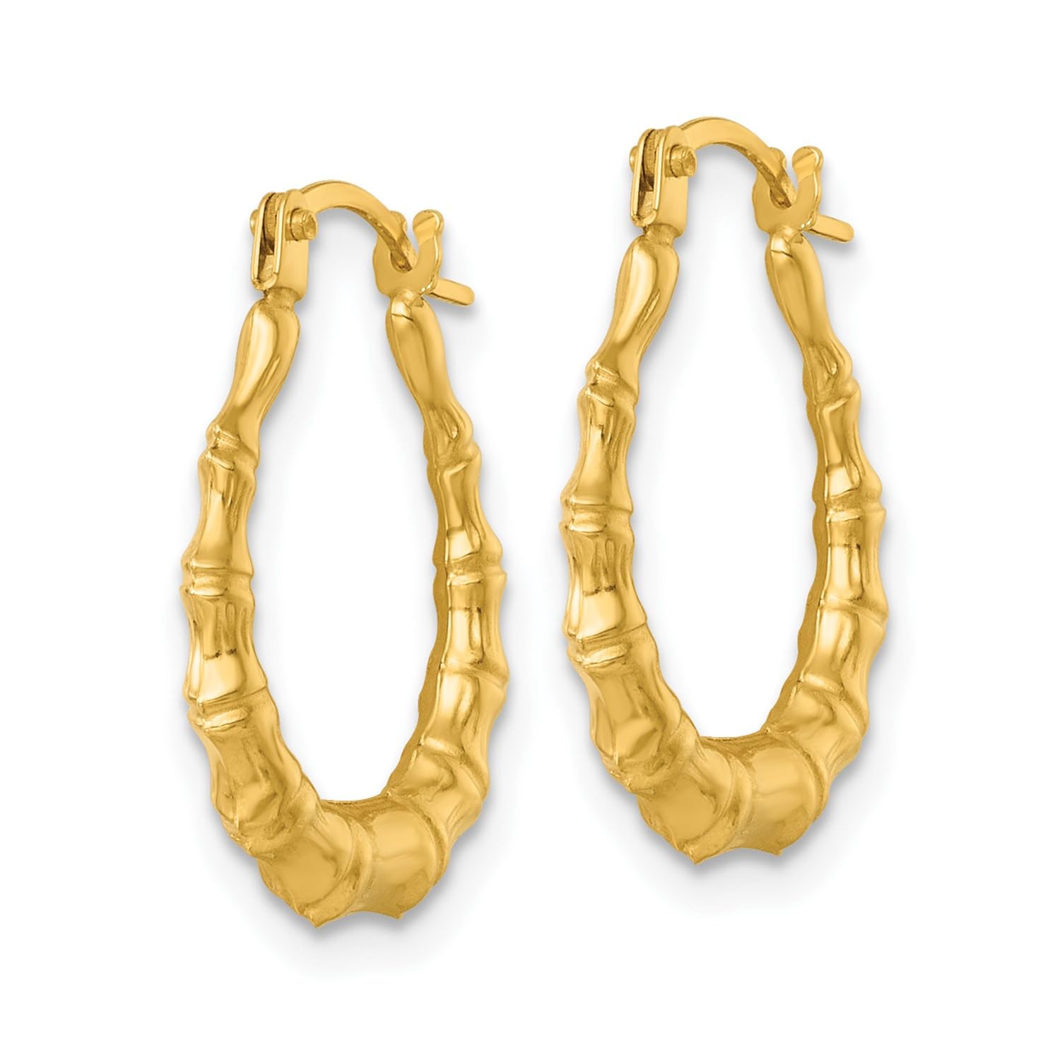 Elevate your style with these exquisite 14k yellow gold polished bamboo-inspired hoop earrings. Measuring 17mm in diameter, these earrings feature a unique and eye-catching design that resembles the natural beauty of bamboo. Crafted from high-quality 14k yellow gold, these earrings are durable and long-lasting. The polished finish adds a touch of elegance, making them suitable for both casual and formal occasions. These earrings are a perfect accessory for those who appreciate timeless beauty and exceptional craftsmanship.