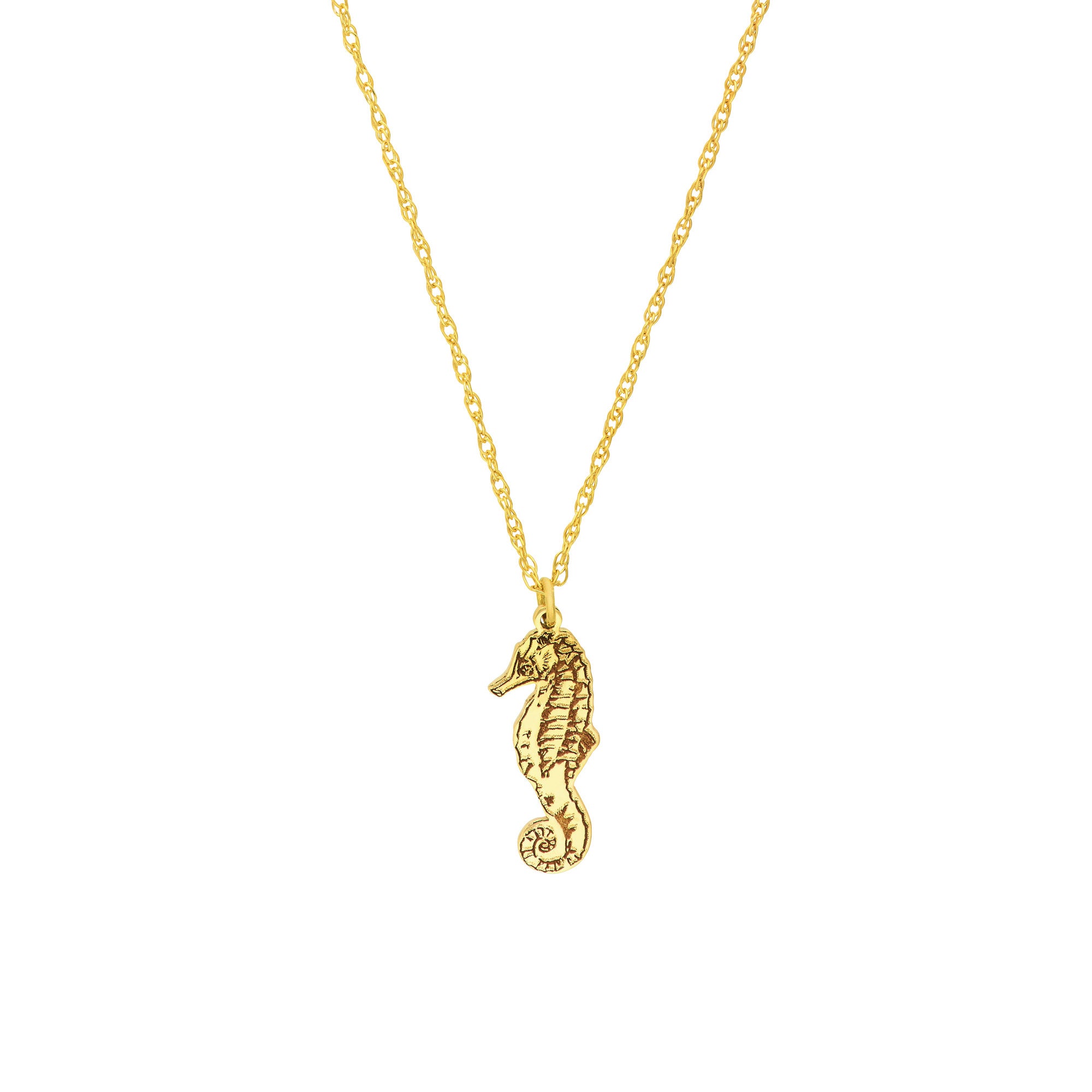 Add a touch of coastal charm to your jewelry collection with this exquisite 14K yellow gold seahorse pendant necklace. The delicately crafted seahorse charm captures the graceful curves and intricate details of these mystical marine creatures, from its distinctive snout to its curled tail. Suspended from an 18-inch gold chain, this dainty pendant makes a perfect statement piece that sits beautifully at the neckline. The warm yellow gold finish adds a timeless elegance that complements any outfit, whether you're dressing up for a special occasion or adding a subtle maritime accent to your everyday wear. This versatile necklace is ideal for ocean lovers and those who appreciate nature-inspired jewelry designs. The secure chain and quality craftsmanship ensure this piece will be treasured for years to come.