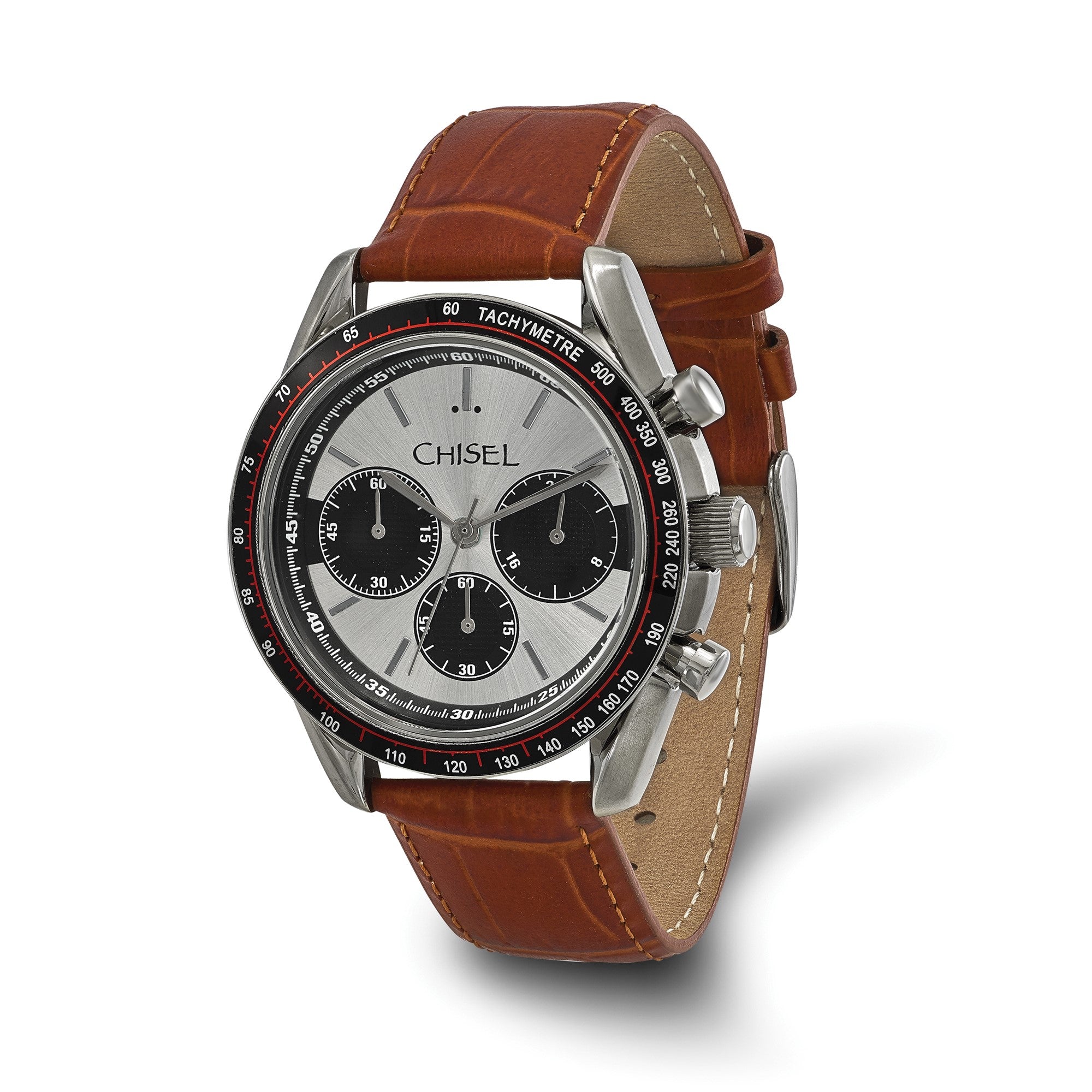 Bold, yet sophisticated would characterize a Chisel brand timepiece. They use contemporary metals like stainless steel and ceramic and add design features found on higher priced luxury watches. This chisel men's stainless steel brown leather chronograph watch features a quartz (battery operated) movement and has a white dial color. The case is 42 x 42 mm in size and includes a limited lifetime warranty.