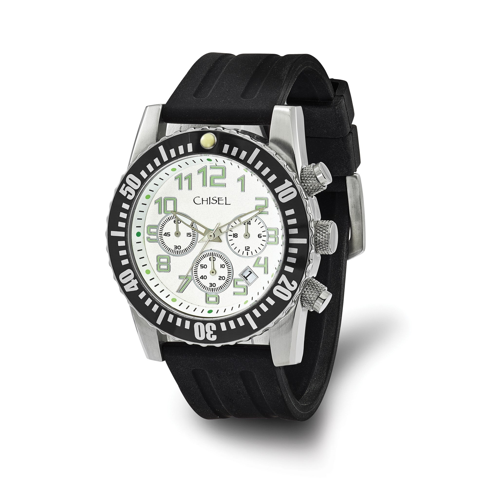 Bold, yet sophisticated would characterize a Chisel brand timepiece. They use contemporary metals like stainless steel and ceramic and add design features found on higher priced luxury watches. This chisel men's white dial silicone strap chronograph watch features a quartz (battery operated) movement and has a white dial color. The case is 45 x 45 mm in size and includes a limited lifetime warranty.