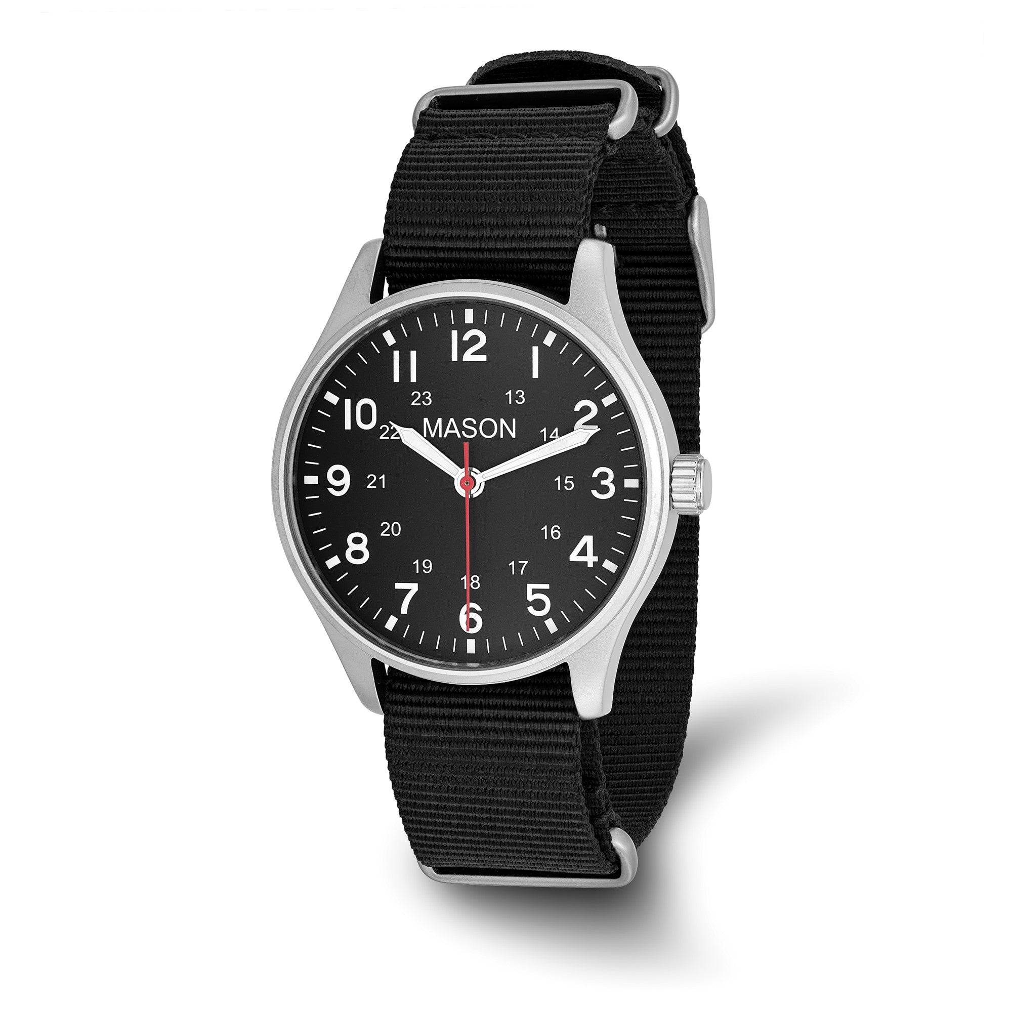Stainless steel men's black nylon strap watch with 40mm case and caseback, mineral crystal, military time, luminous hands and Arabic numerals on black dial. This watch has Japanese quartz movement, 10 ATM water resistance, buckle clasp and two year warranty on movement type. Watch band measures approximately 8 1/2" long and 3/4" wide.